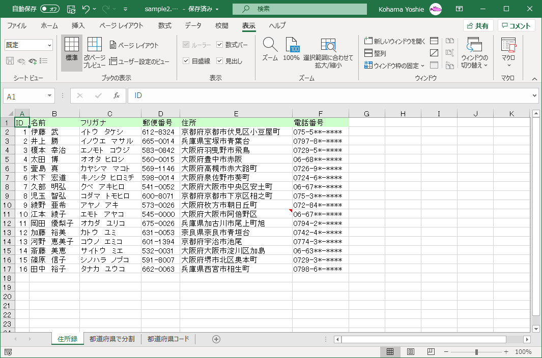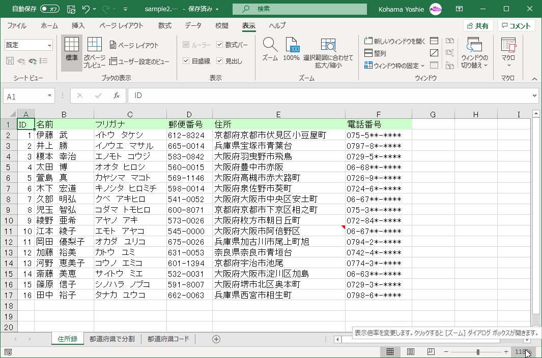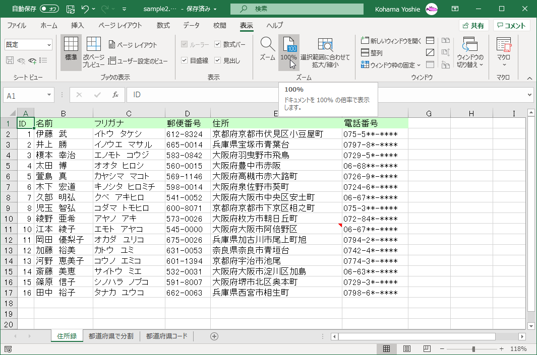 - [表示]タブを開き、[ズーム]グループの[100%]をクリックします。