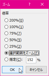 ステータスバー右端のズームスライダーの倍率表示をクリックし、[ズーム]ダイアログボックス一覧から[選択範囲をズーム]を選択してもOKです。