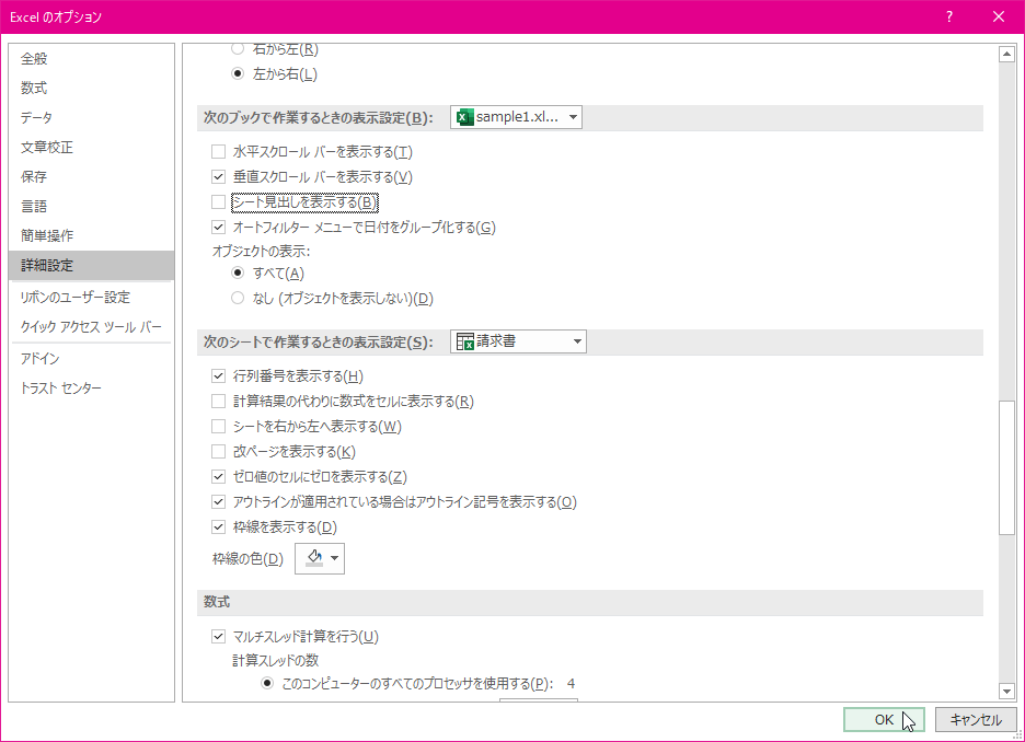 - [次のブックで作業するときの表示設定]オプションで、[水平スクロールバーを表示する]にのチェックを外し、[OK]ボタンをクリックします。