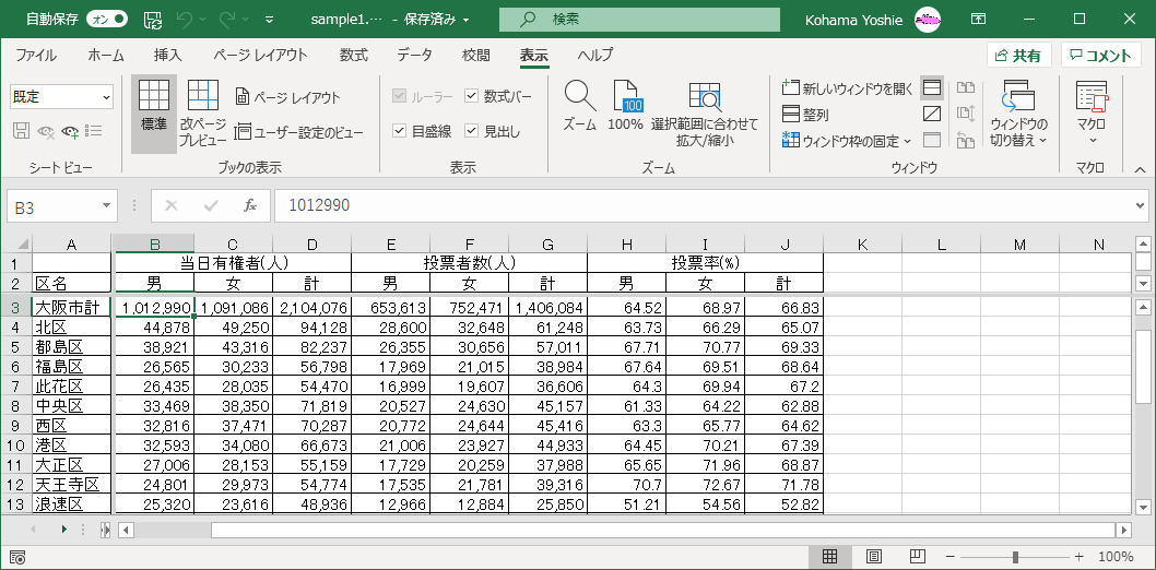 - ウィンドウを分割したい内側のセルを選択して[表示]タブを開き、[ウィンドウ]グループの[分割]をクリックします。
