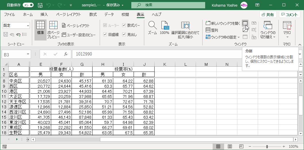 ウィンドウを複数の表示領域に分割し、個別にスクロールできるようにするには、ウィンドウを分割するとOKです。ウィンドウを分割したい内側のセルを選択して[表示]タブを開き、[ウィンドウ]グループの[分割]をクリックします。