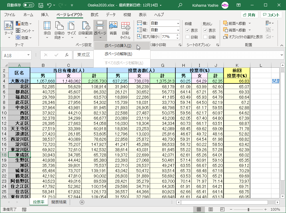 - 右クリックしてショートカットメニューより[改ページの挿入]を選択します。