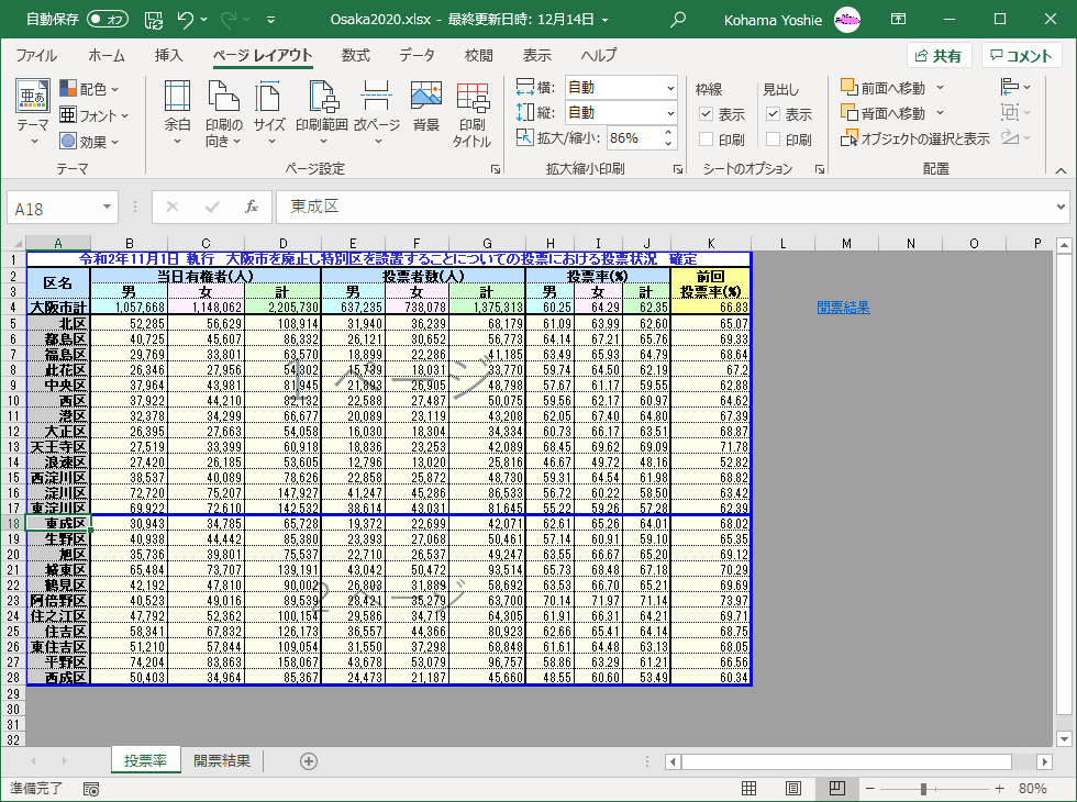 改ページのすぐ下のセルを選択して[ページレイアウト]タブの[改ページ]一覧より[改ページの解除]をクリックします。