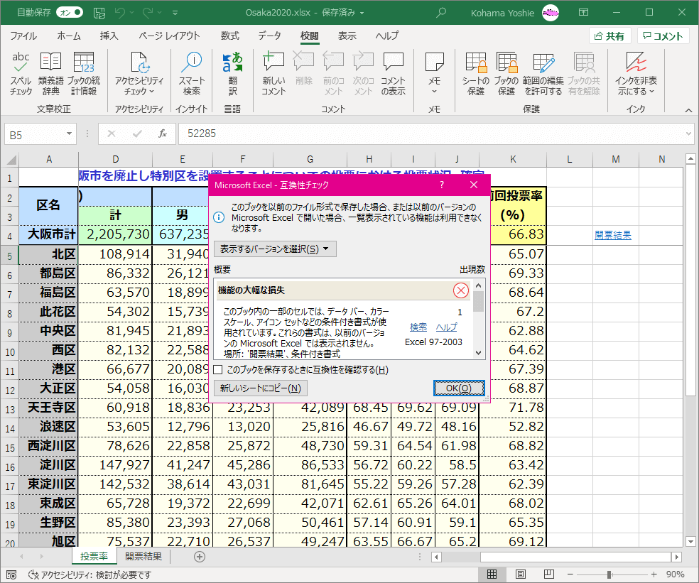 [Microsoft Excel - 互換性チェック]ダイアログボックスの[このブックを保存するときに互換性を確認する]にチェックを入れておくと、保存時に互換性チェックが実行されます。
