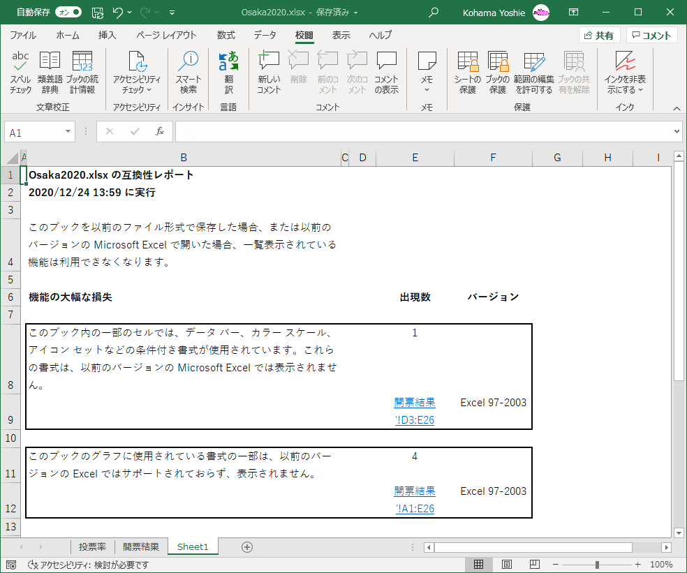 [Microsoft Excel 互換性チェック]の[新しいシートにコピー]をクリックすると、互換性レポートが新しいシートにコピーされます。