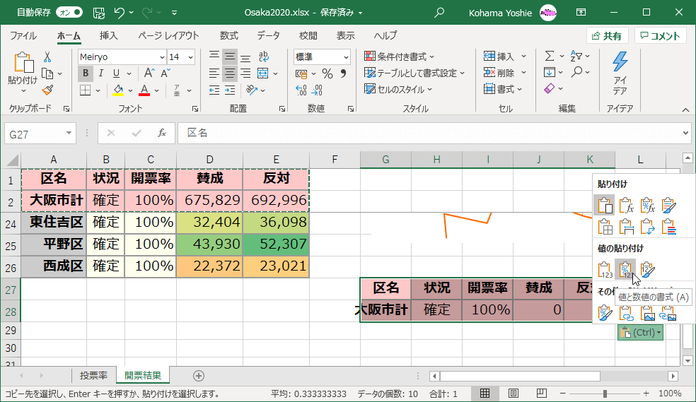 値と元の書式- コピーしたセルの値と書式を貼り付けます。