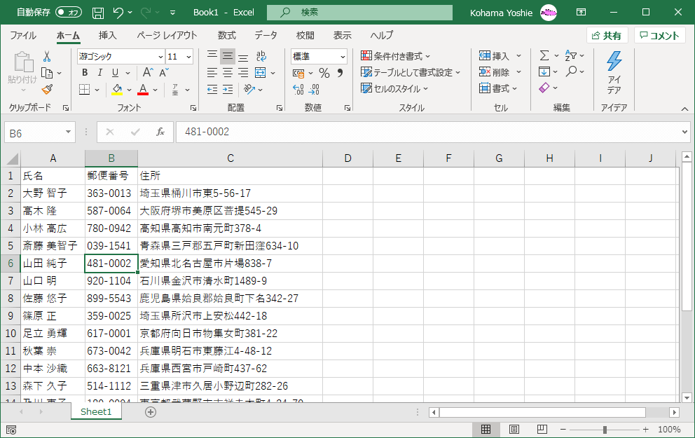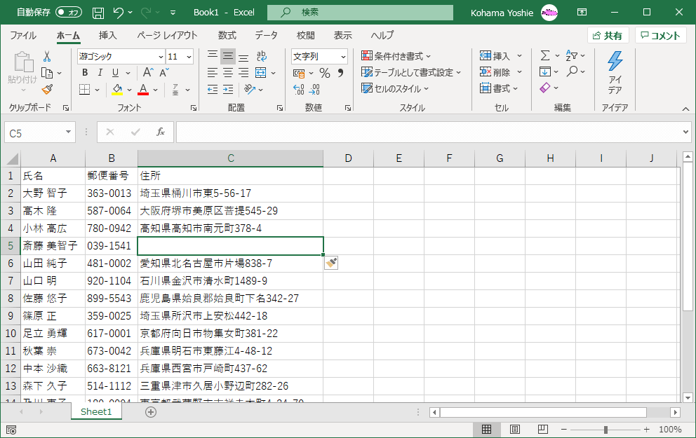 セルを挿入するには、挿入すべき場所の下のセルを選択して、[ホーム]タブの[セル]グループの[挿入]をクリックします。すると、以下のデータが下方向にシフトされます。セルの挿入時に右方向にシフトする場合は、ショートカットキーCtrl+Shift+=キーを押して、[挿入]ダイアログボックスより選択します。