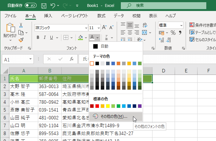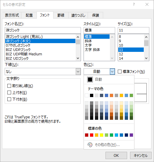 [フォントの色]ボタンの一覧からフォントの色を選択します。[セルの書式設定]ダイアログボックスの[フォント]タブにも[色]ボックスがあります。
