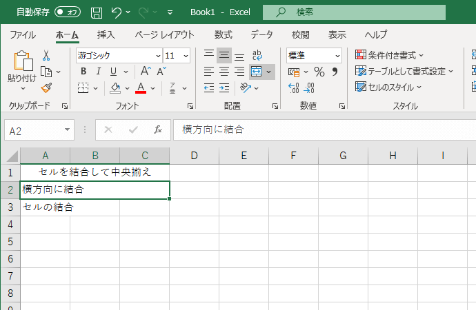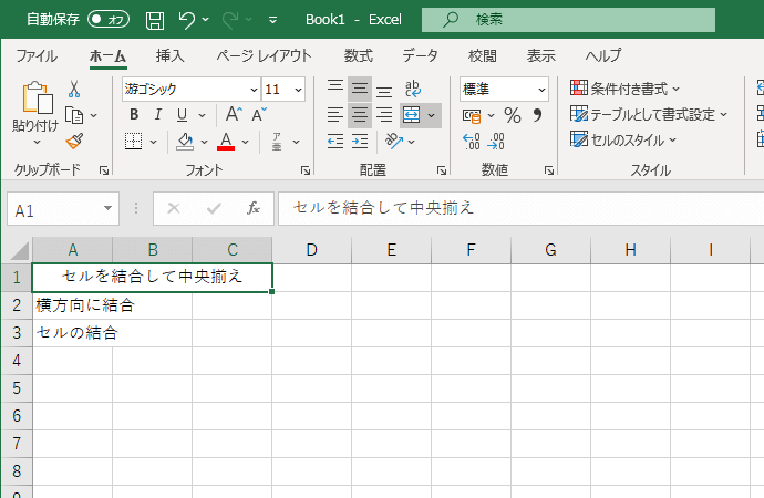 もう一度[セルを結合して中央揃え]ボタンをクリックすると、セルの結合が解除されます。