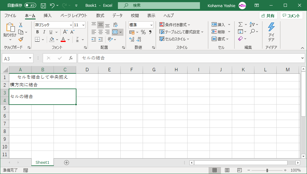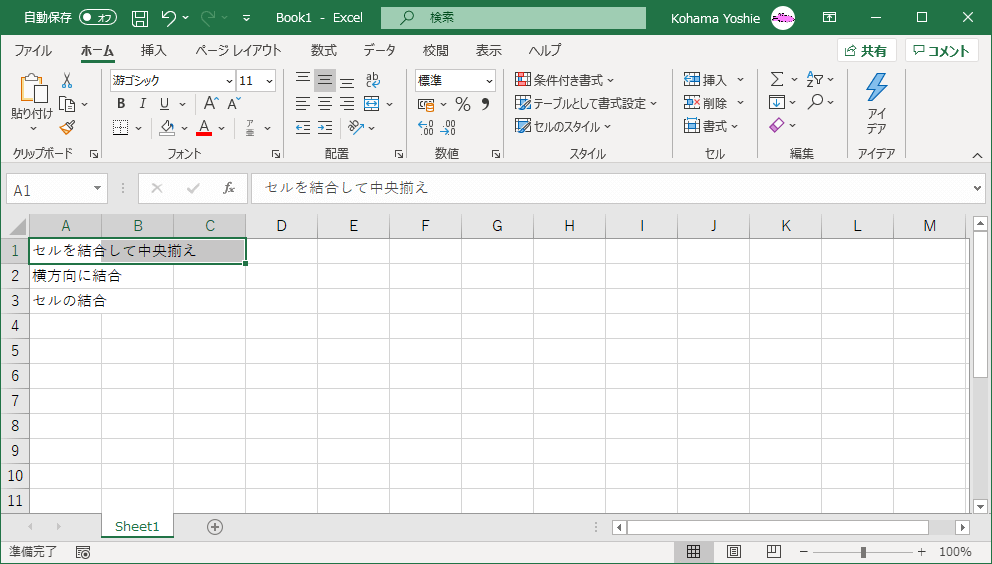 - セルが結合して中央揃えになりました。