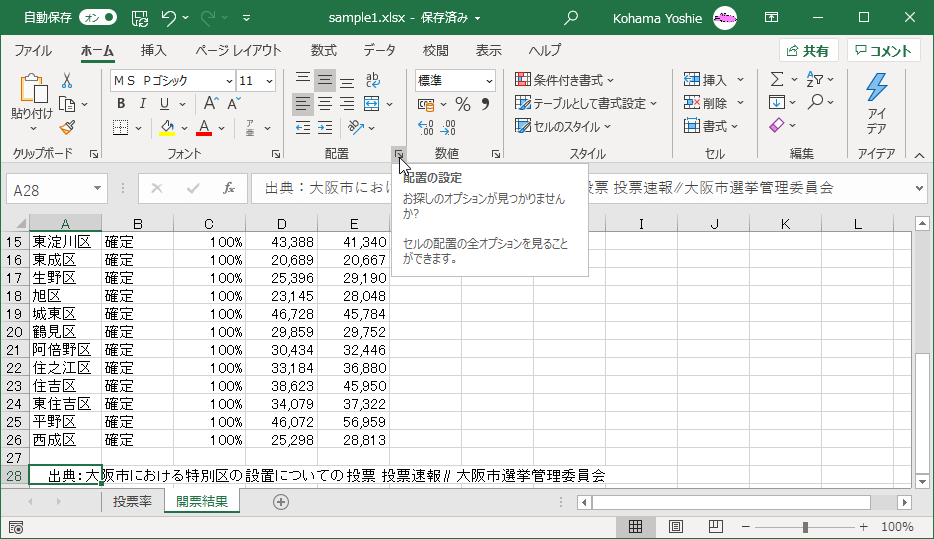 - インデントを増やしたいセルと選択し、[ホーム]タブの[配置]グループの