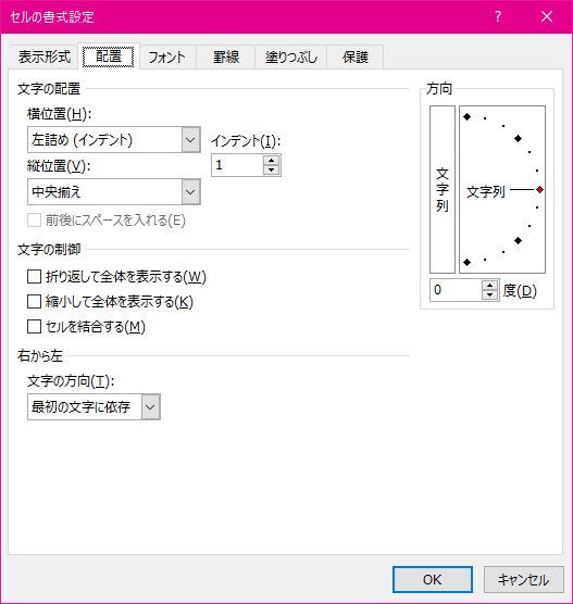インデントを1つ増えると、[セルの書式設定]ダイアログボックスの[配置]タブにて、[横位置]が[左詰め (インデント)]に変化し、[インデント]の値が1増えます。