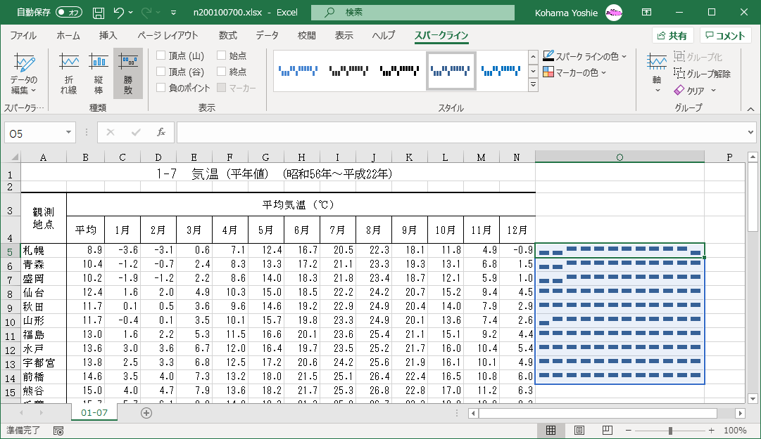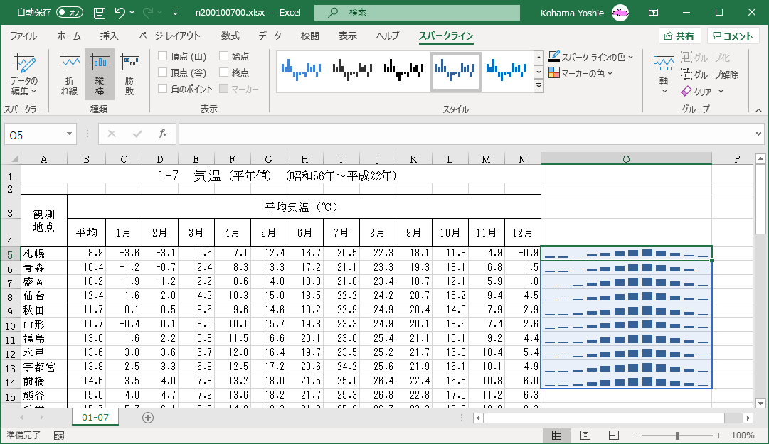 後で他のスパークラインに変換するには、スパークライン内にカーソルを移動して[スパークライン]タブの[種類]グループから変換したいスパークラインを選択します。