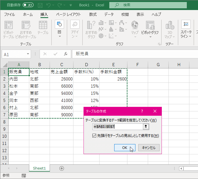 選んだ範囲の最初の行にテーブル見出しとして使うデータが含まれている場合は、[先頭行をテーブルの見出しとして使用する]チェック