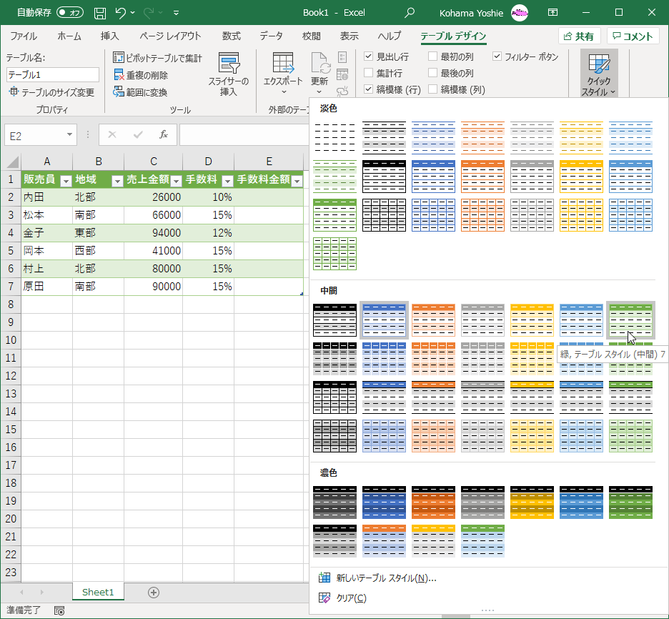 Excelには多数の定義済みのテーブル クイック スタイルが用意され、これを使用するとテーブルの書式をすばやく変更できます。テーブル内にカーソルを移動して[テーブル デザイン]タブを開き、[テーブルスタイル]グループの[クイックスタイル]一覧から選択します。ギャラリー内のスタイルの上にマウスのカーソルを置くと、表がどのように表示されるのかプレビューすることができます。