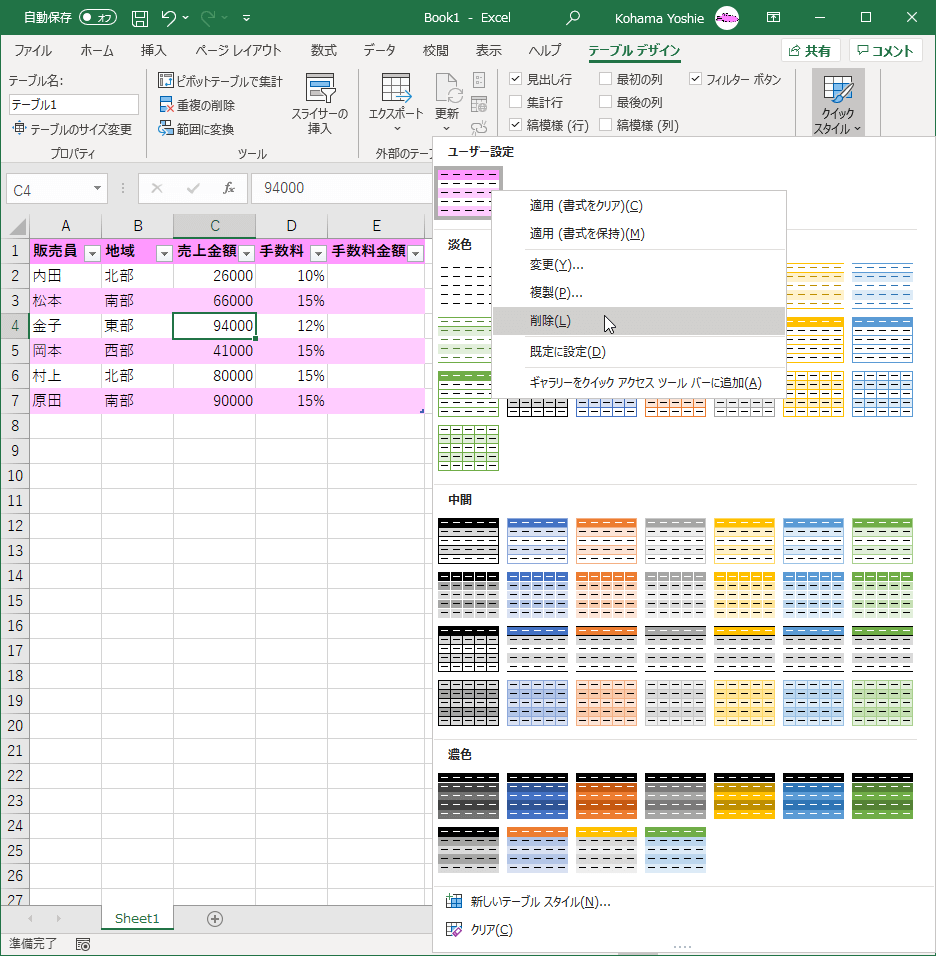 - [テーブルスタイル]グループの[クイックスタイル]一覧より変更したいスタイルを右クリックして、ショートカットメニューより[削除]をクリックします。
