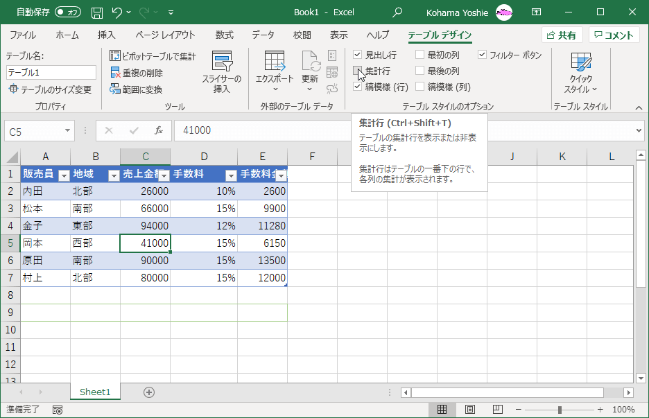 テーブル内にカーソルを移動して[テーブルデザイン]タブを開き、[テーブルスタイルのオプション]グループから[集計行]にチェックを付けます。集計行はテーブルの一番下の行で、各列の集計が表示されます。ショートカットキーはCtrl+Shift+Tです。あらかじめデータを抽出しておくことで、抽出されたデータの集計が表示されるようになります。