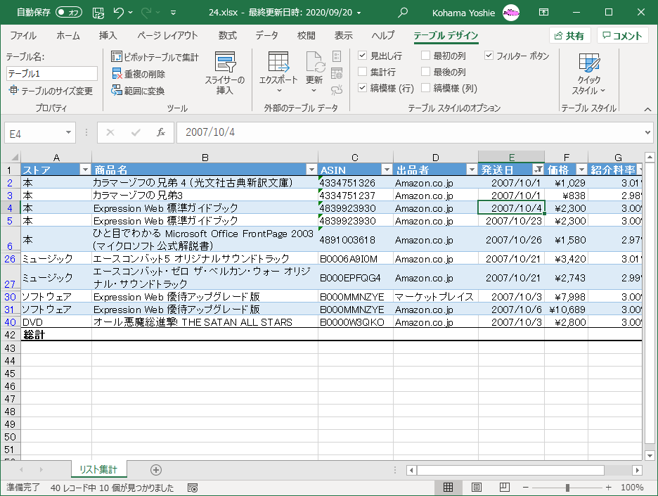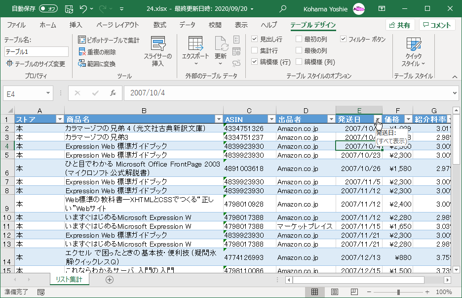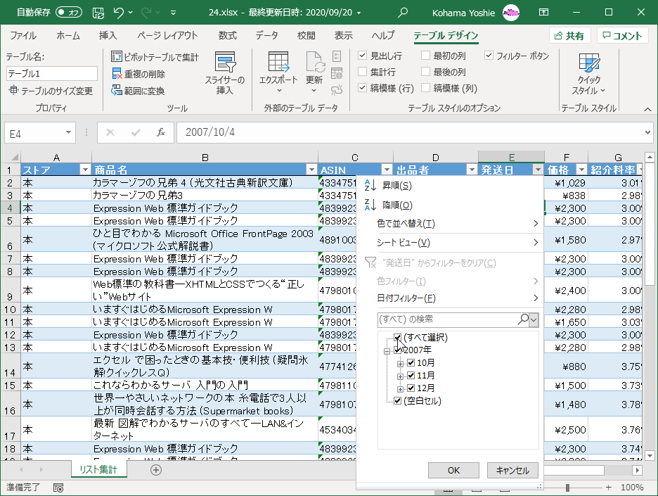 テーブルのデータをフィルターする、並べ替える