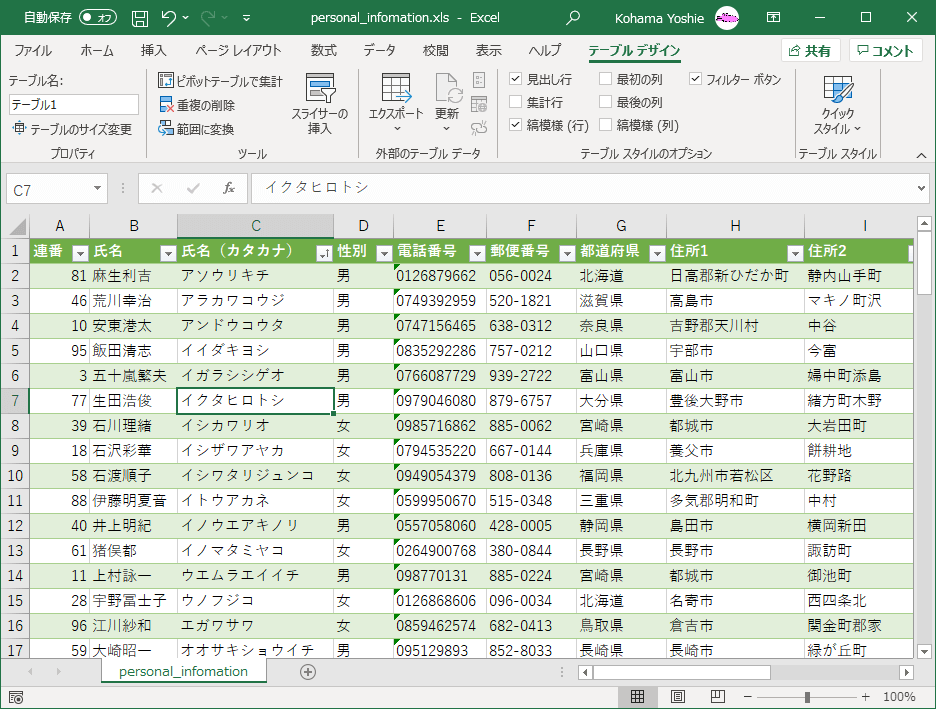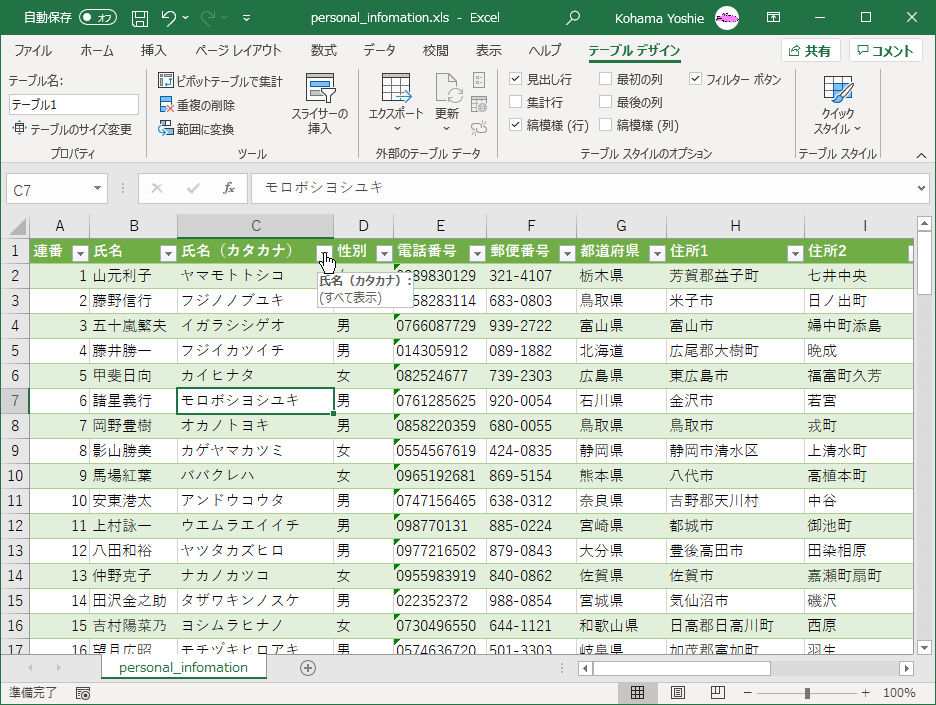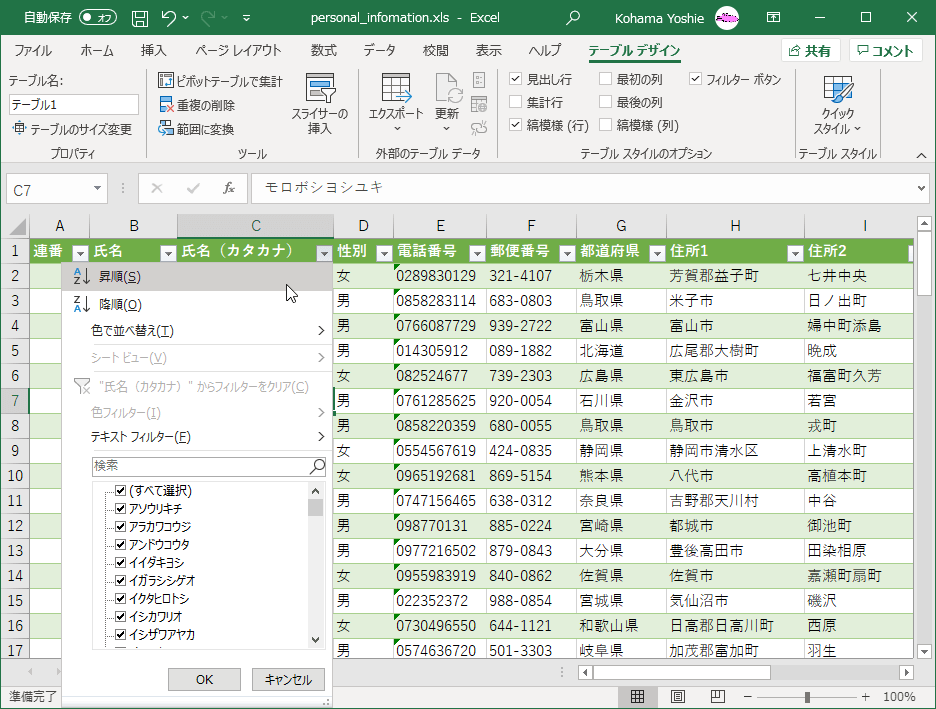 テーブルのデータをフィルターする、並べ替える