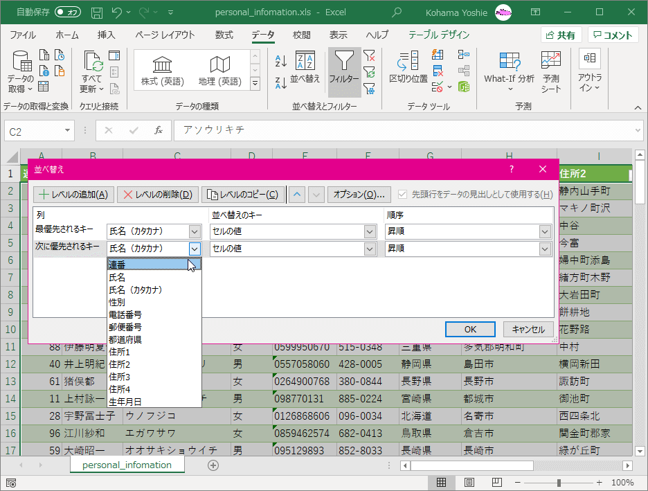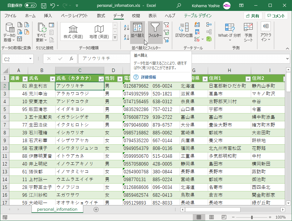 テーブルのデータをフィルターする、並べ替える
