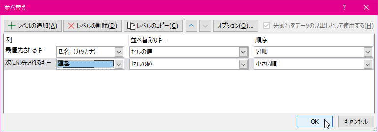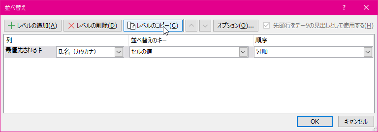 - コピーしたい並べ替えの条件を選択して[レベルのコピー]ボタンを押します。