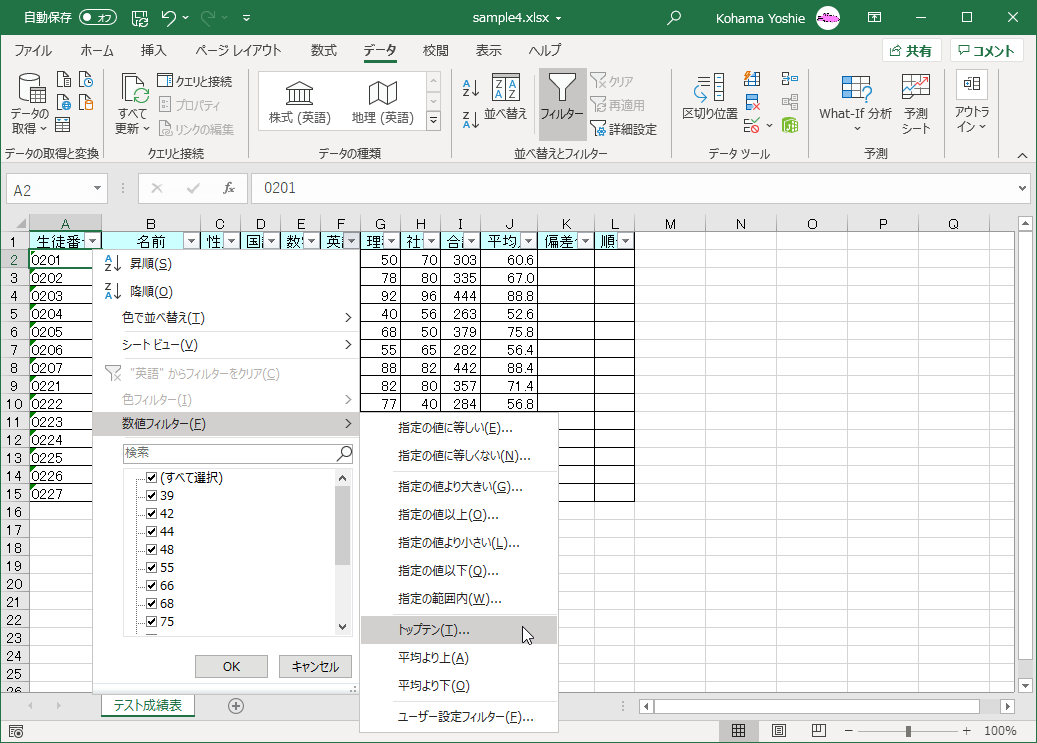 - [数値フィルター]一覧から[トップテン]を選択します。