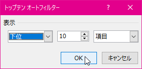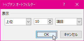 - [トップテンオートフィルター]ダイアログボックスにて[上位]または[下位]を選択します。トップテンの場合は[上位]のままにします。