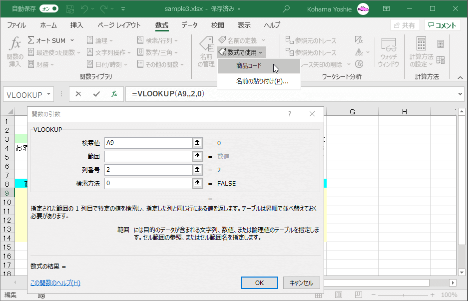 数式に名前付き範囲および名前付きテーブルを使用するには