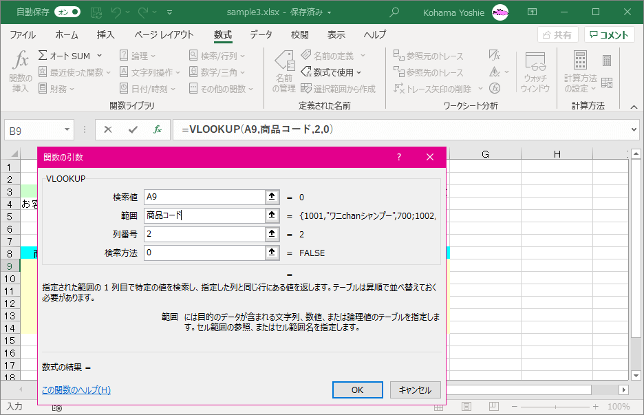 - あらかじめ、[商品コード]シートの商品コードのセル範囲から「商品コード」という名前を入力しておきます。