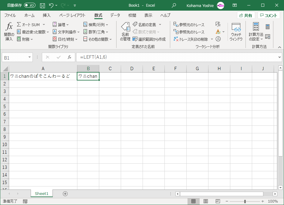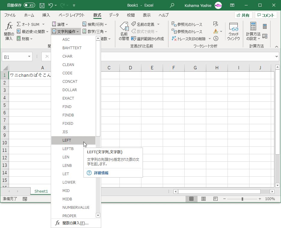 - 求めるセルを選択し、[数式]タブを開き、[文字列操作]をクリックします。