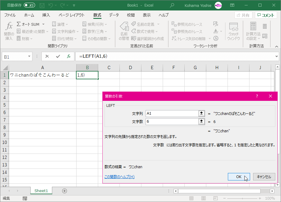 [文字数]ボックスには、6文字を抜き出すには「6」と入力して[OK]ボタンをクリックします。