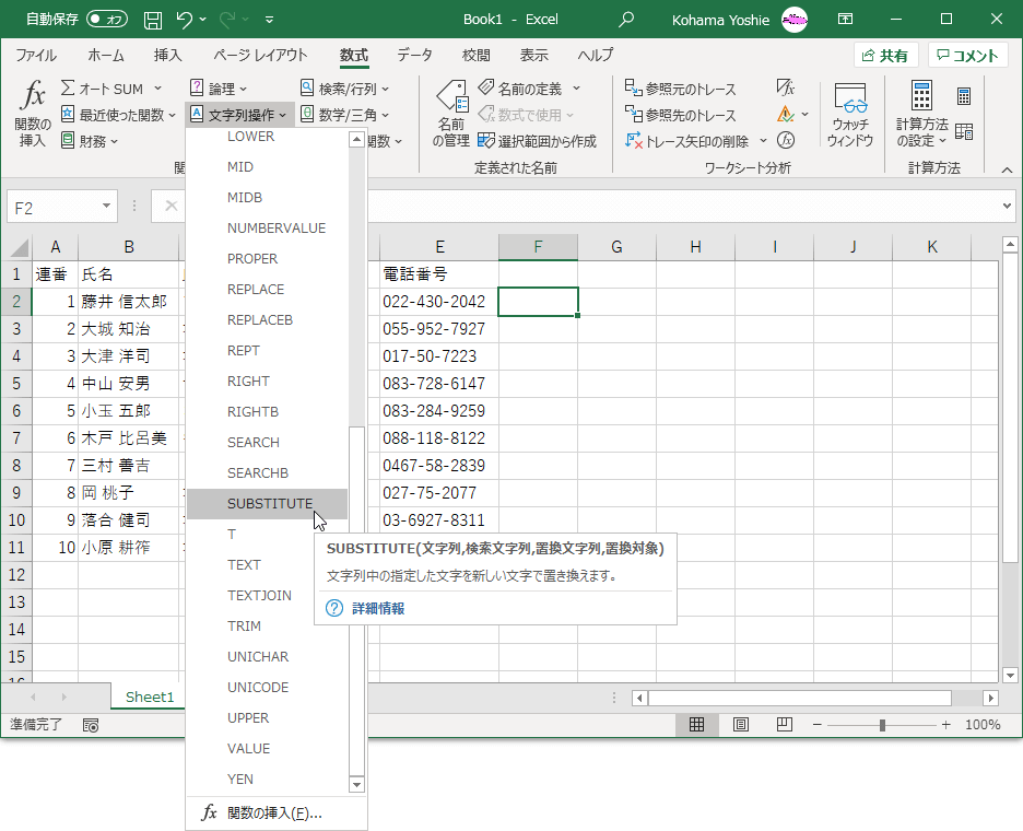求めたいセルを選択して[数式]タブの[関数ライブラリ]の中から[文字列操作]をクリックし、一覧から[SUBSTITUTE]を選択します。