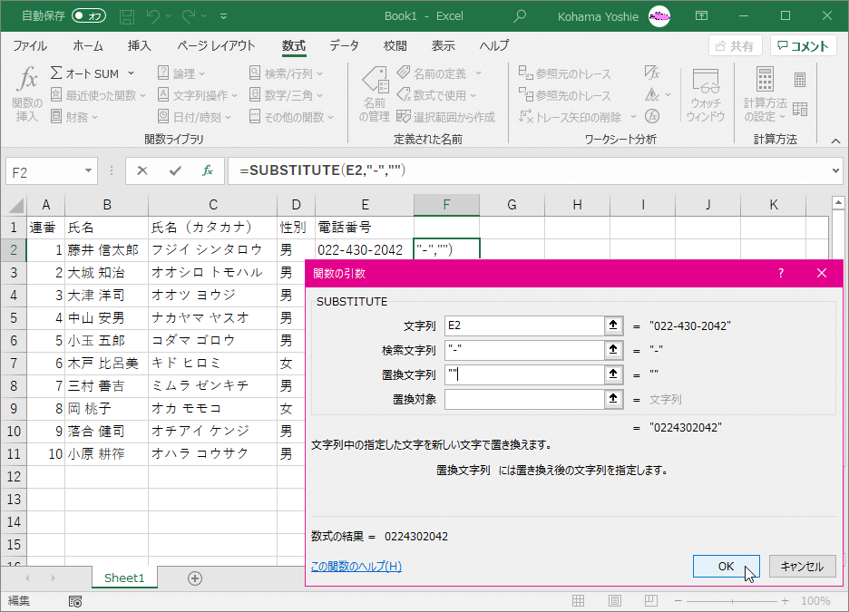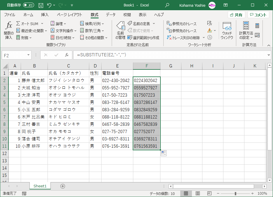 - 数式コピーすることで、すべての電話番号のハイフンが取り除かれました。