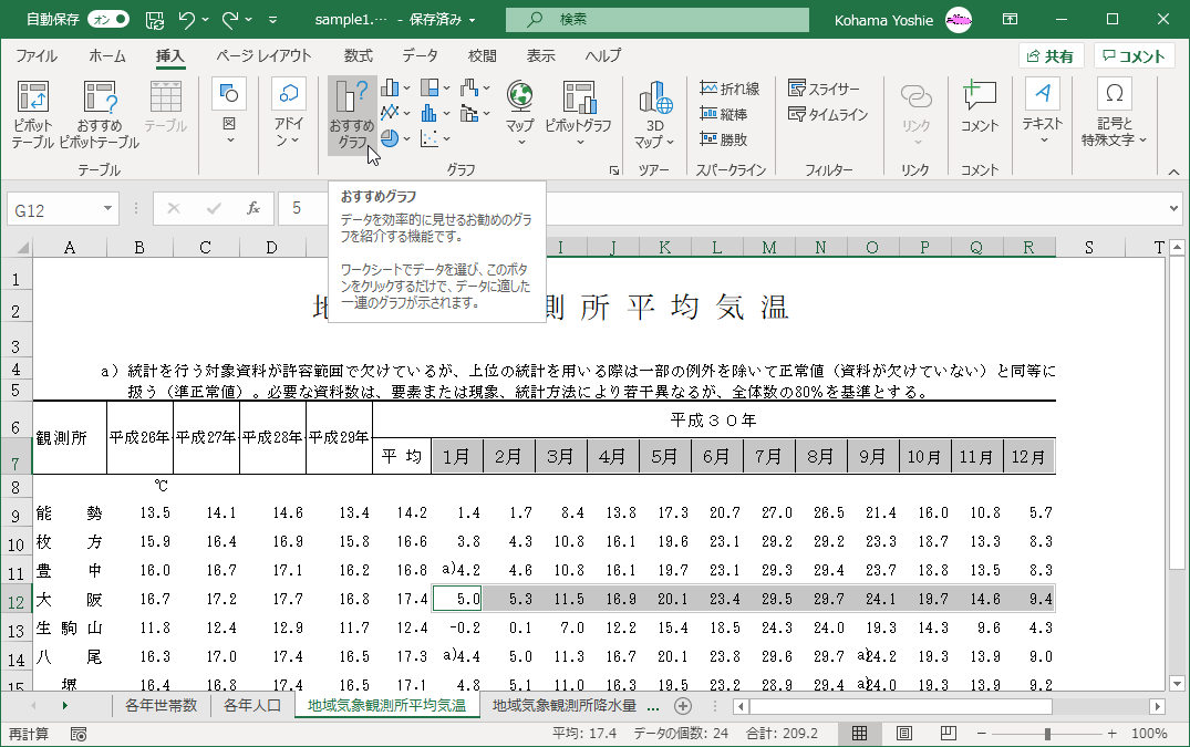 - [挿入]タブの[グラフ]グループから[おすすめグラフ]をクリックします。