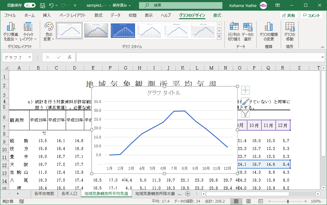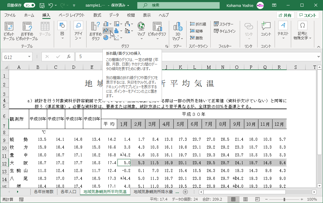 気温の変化を表すグラフは折れ線グラフが最適です。項目軸とデータ範囲を指定して[挿入]タブの[折れ線/面グラフの挿入]一覧から[折れ線]を選択します。[挿入]タブの[おすすめグラフ]一覧から折れ線グラフを作成することも可能です。