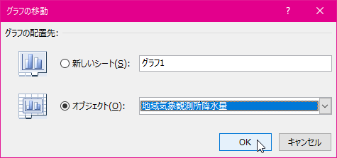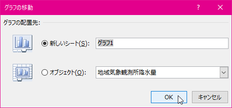 - [グラフの移動]ダイアログボックスよりグラフの配置先を選択して[OK]ボタンをクリックします。