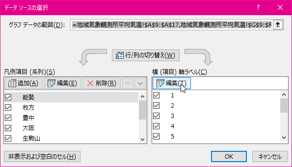 - [データソースの選択]ダイアログボックスの[横(項目)軸ラベル]ボックスの[編集]ボタンをクリックします。