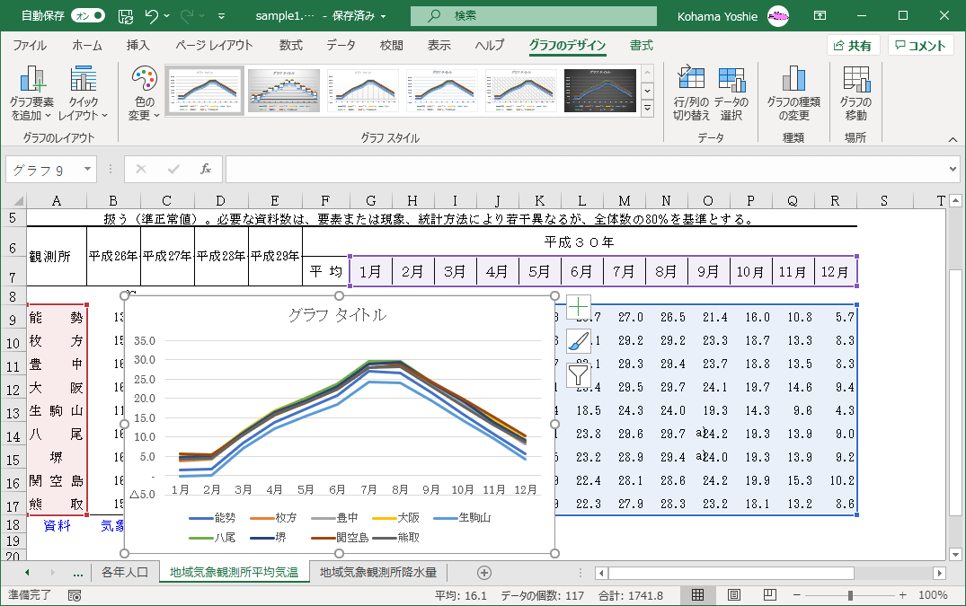 対象となるグラフを選択し、[グラフのデザイン]タブの[データ]グループの[グラフデータの選択]をクリックします。