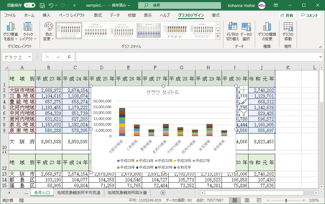 - グラフを選択して[グラフのデザイン]タブを開きます。
