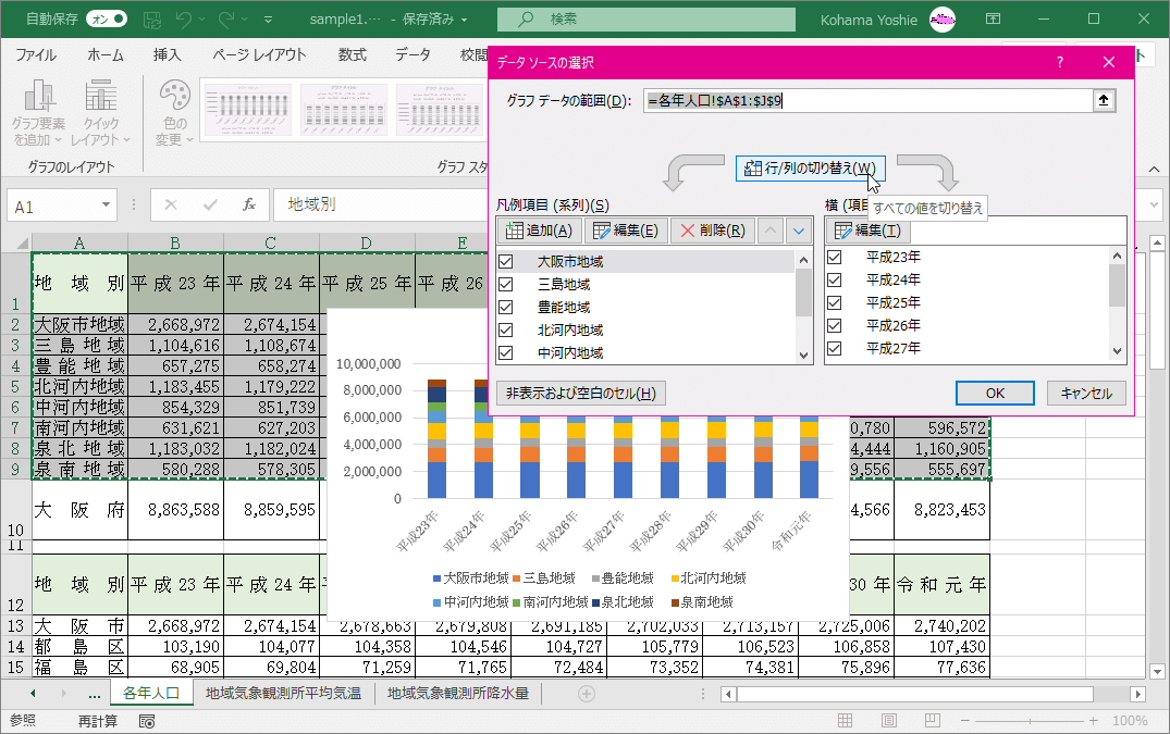 - [データソースの選択]ダイアログボックスの[行/列の入れ替え]ボタンをクリックします。