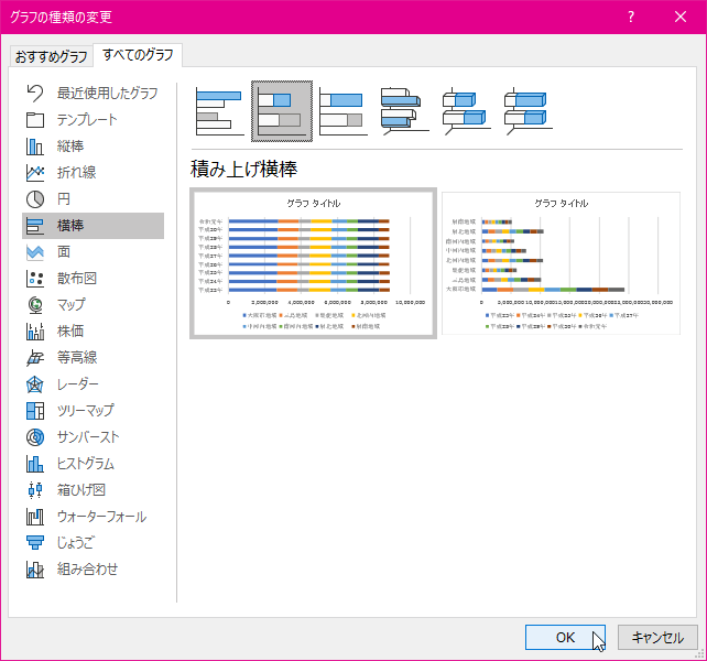 [グラフの種類の変更]ダイアログボックスの[すべてのグラフ]タブが開きます。[横棒]一覧から[積み上げ横棒]を選択して[OK]ボタンをクリックします。