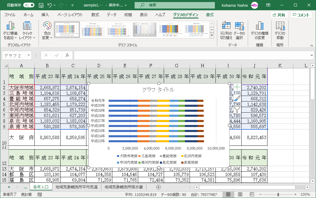 別の種類のグラフに変更するには、グラフを選択し、[グラフのデザイン]タブを開いて、[種類]グループの[グラフの種類の変更]をクリックし、[グラフの種類の変更]ダイアログボックス一覧から変更したいグラフを選択します。ここでは、積み上げ縦棒から積み上げ横棒に変更する方法について説明します。