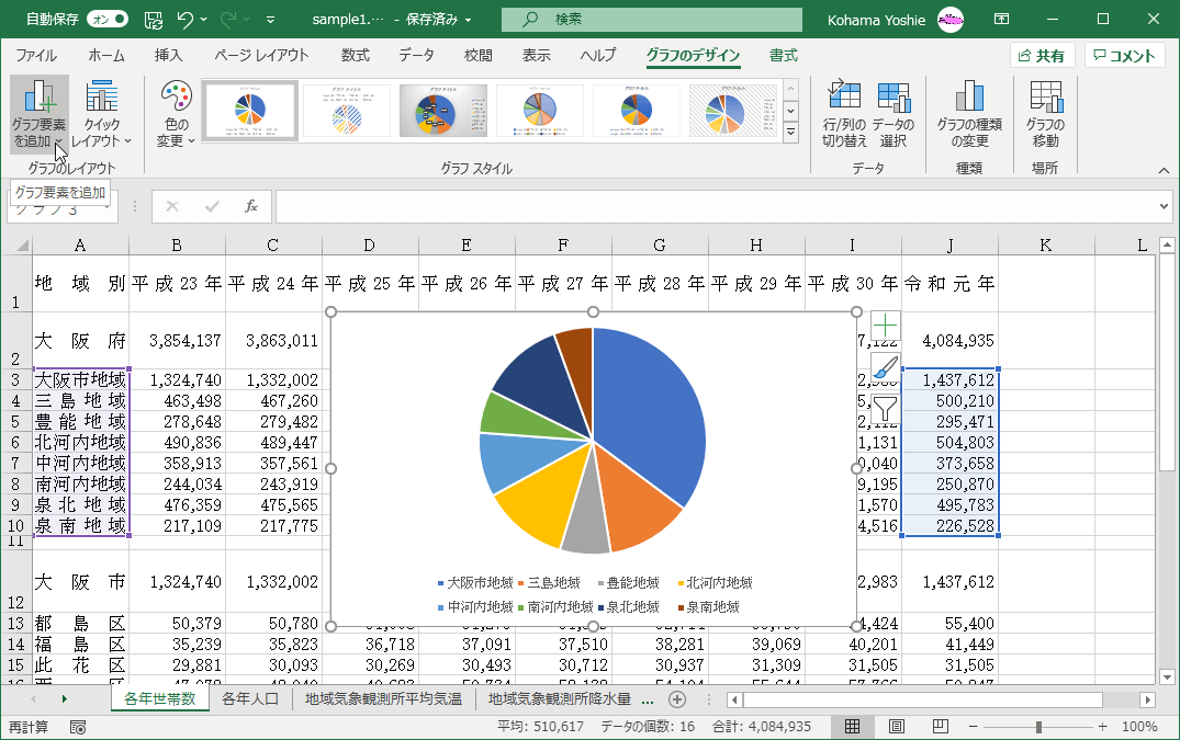 - グラフを選択し、[グラフのデザイン]タブの[グラフ要素を追加]ボタンをクリックします。