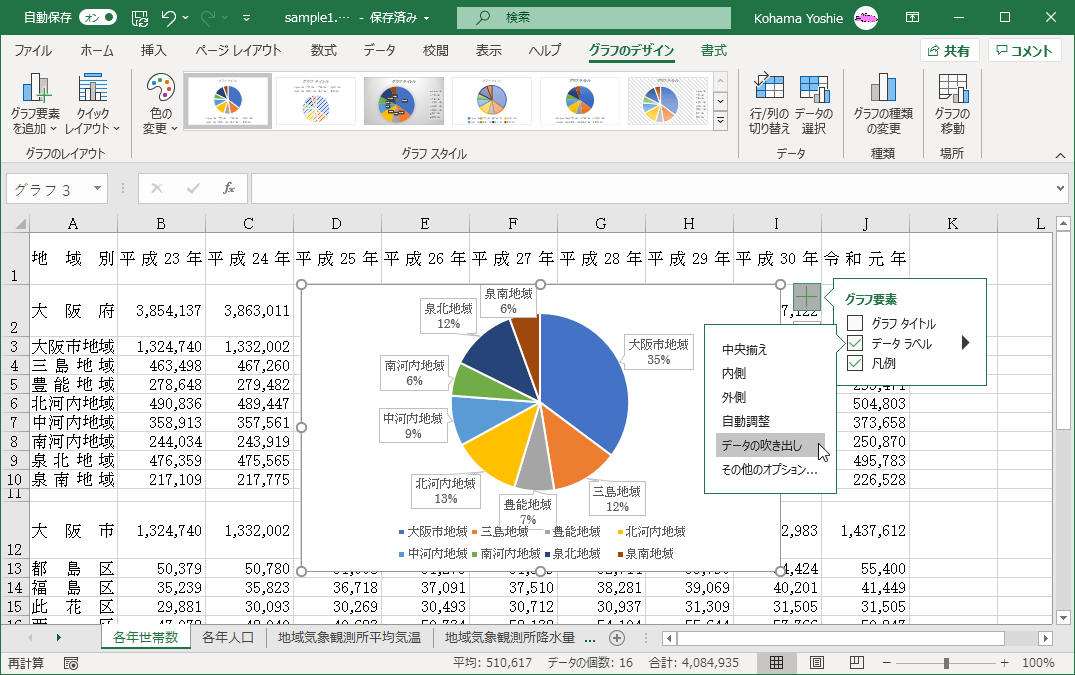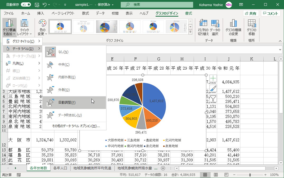 - [データラベル]をポイントして、ラベルの配置方法を選択します。