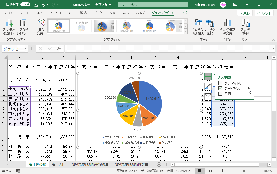 データラベルの表示・非表示は、グラフを選択したときの[グラフ要素]ボタンで簡単に行えます。[グラフのデザイン]タブの[グラフのレイアウト]グループ、[グラフ要素の追加]をクリックして、[データラベル]オプションより配置方法を選択してもOKです。
