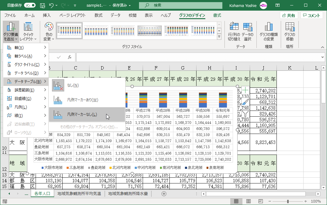 [グラフのデザイン]タブの[グラフ要素を追加]ボタンより[データテーブル]をポイントして、[その他のデータテーブルオプション]を選択します。