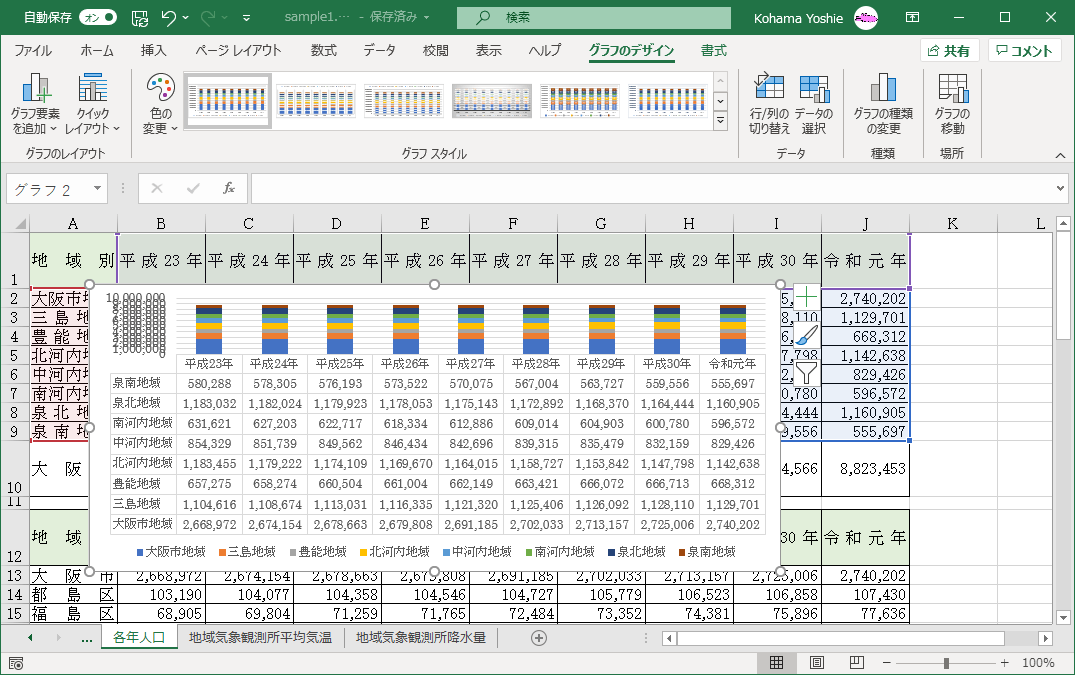 - グラフを選択し、[グラフのデザイン]タブの[グラフ要素を追加]ボタンをクリックします。