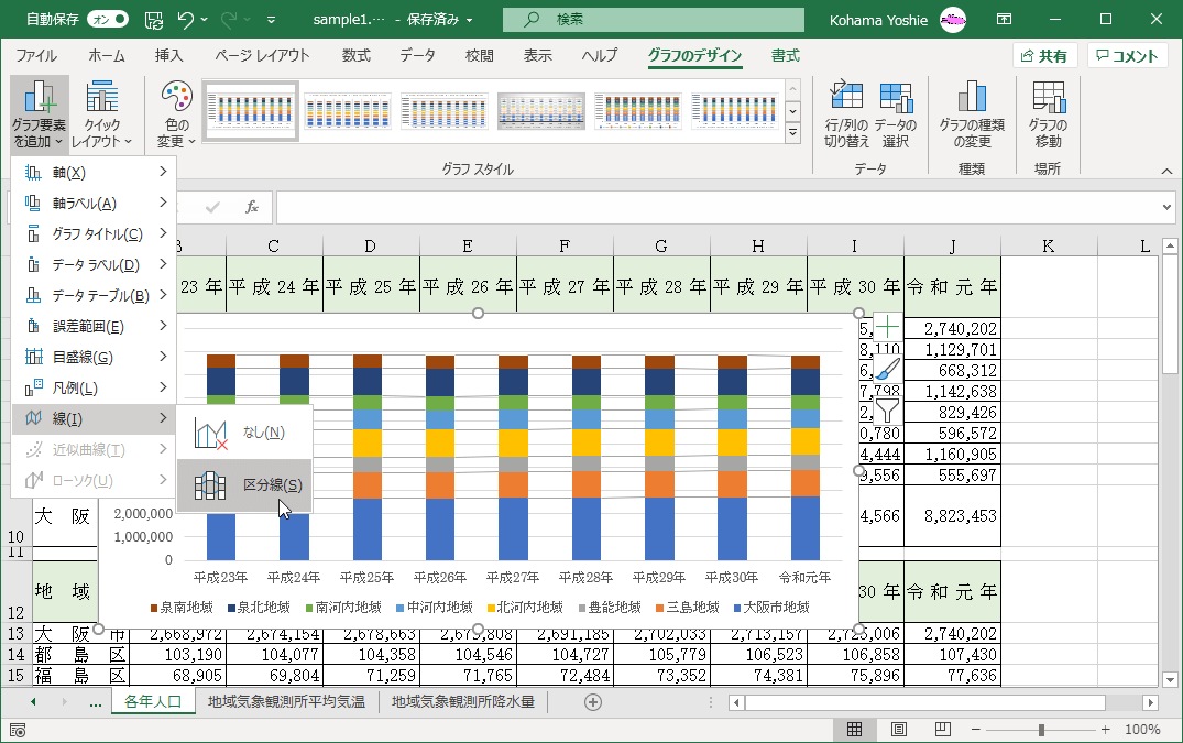 積み上げ棒グラフで区分線を付けて推移の割合をわかりやすくするには、グラフを選択し、[グラフのデザイン]タブの[グラフ要素を追加]ボタンより[線]をポイントして、[区分線]を選択します。