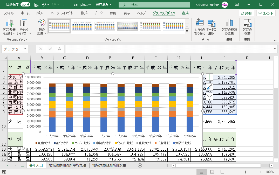 - グラフを選択し、[グラフのデザイン]タブの[グラフ要素を追加]ボタンをクリックします。