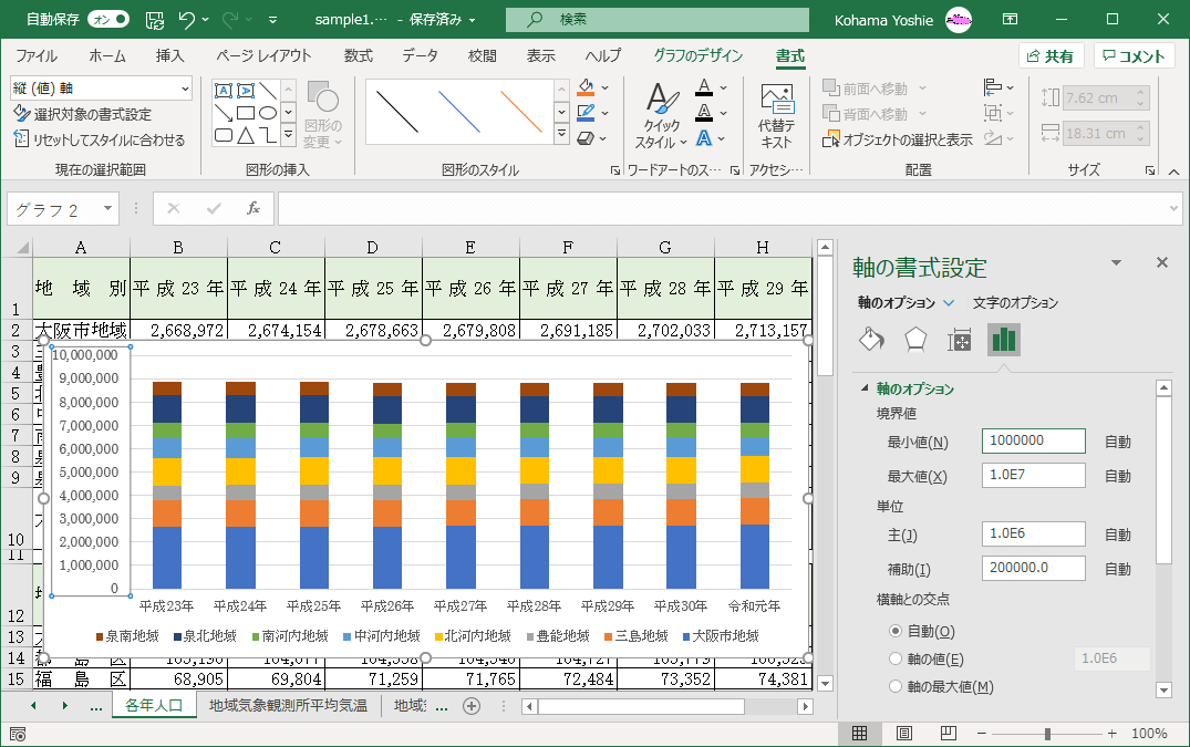 主軸を右クリックしてショートカットメニューより[軸の書式設定]をクリックするか、主軸をクリックして[書式]タブを開き、[現在の選択項目]グループの[選択対象の書式設定]をクリックします。